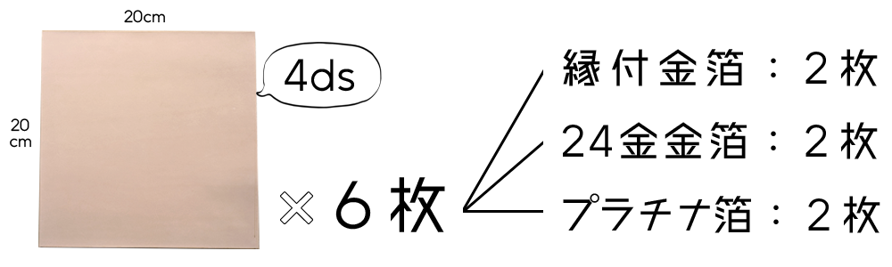 20cm角(4ds)の革が6枚の各2枚ずつに縁付金箔、24金金箔、プラチナ箔を貼る場合